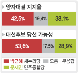 세계일보가 여론조사업체 월드리서치에 의뢰해 전국 19세 이상 1000명에게 24일 “내일이 대선일이라면 새누리당 박 후보와 야권 단일 문 후보 중 누구에게 투표하겠는가”라고 물은 결과 박 후보 42.5%, 문 후보 38.1%로 오차범위(±3.1%포인트) 내에서 박 후보가 4.4%포인트 앞섰다. ‘모름’ 또는 무응답은 최근 2주간 실시됐던 박·문 후보 양자대결 조사에서 평균 8∼9%였으나 이번 조사에서는 19.4%에 달했다. 안 전 후보 사퇴 이후 부동층이 두 배 이상 늘어난 셈이다.