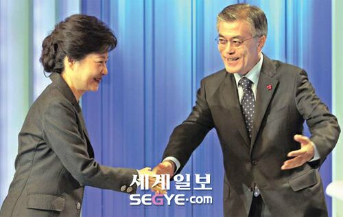 | 새누리당 박근혜 후보(왼쪽)와 민주통합당 문재인 후보가 4일 중앙선관위 주최 TV토론회가 열린 서울 여의도 MBC 스튜디오에서 만나 토론에 앞서 악수하고 있다. 이제원 기자 |