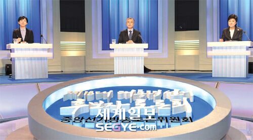 | 새누리당 박근혜, 민주통합당 문재인, 통합진보당 이정희 대선후보(오른쪽부터)가 4일 서울 여의도 MBC 스튜디오에서 중앙선거관리위원회가 주최하는 첫 TV토론을 하고 있다. 이제원 기자 |