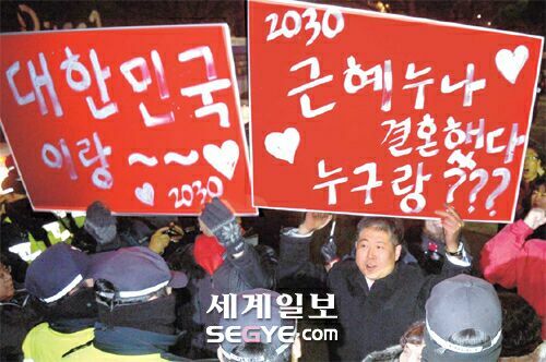 | 4일 중앙선관위 주최 첫 대선 TV토론이 열린 서울 여의도 MBC 스튜디오 앞에서 새누리당 박근혜 후보 지지자들이 응원전을 펼치고 있다. 이제원 기자 |
