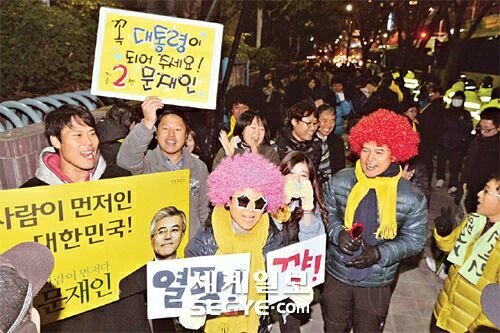| 4일 중앙선관위 주최 첫 대선 TV토론이 열린 서울 여의도 MBC 스튜디오 앞에서 민주통합당 문재인 후보 지지자들이 응원전을 펼치고 있다. 이제원 기자 |
