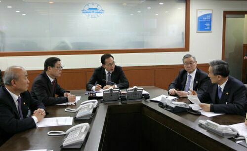 | 긴박한 NSC 이명박 대통령(가운데)이 12일 오전 청와대 국가위기관리실에서 국가안전보장회의를 열어 류우익 통일부 장관(왼쪽부터), 김황식 총리, 김성환 외교장관, 김관진 국방장관 등과 함께 북한의 장거리 미사일 발사와 관련된 대응책을 논의하고 있다. 청와대 제공 |