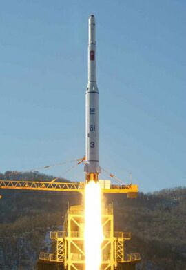 | 북한 장거리 미사일 ‘은하 3호’가 12일 오전 평안북도 철산군 동창리 발사장에서 화염을 내뿜으며 발사되고 있다. 연합뉴스 |