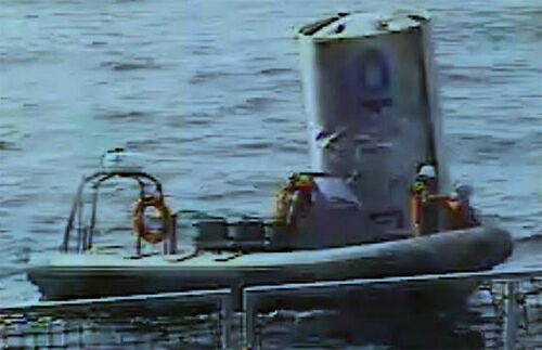 | 은하 3호의 ‘하’자 뚜렷 해군 최영함 소속 요원들이 12일 고속단정으로 북한 장거리 미사일 1단 추진체 잔해로 추정되는 낙하물에 접근해 위치표시용 부표를 달고 있다. 이 낙하물은 군산 서쪽 160여㎞ 해상에서 발견됐고 부표를 단 뒤 수심 80m 해저로 가라앉았다. 군 당국은 현재 구조함인 청해진함을 투입해 인양작업을 펴고 있다. 국방부 제공 |