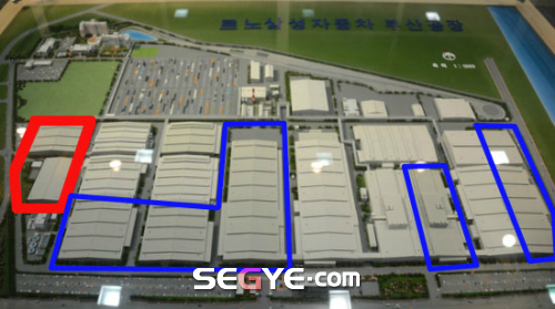 | ▶ 르노삼성자동차 부산공장. 붉은색 사각형 안쪽이 매각 추진지역이고 파란색 사각형은 제2공장 예정부지다. 현재는 붉은색과 파란색을 제외한 곳에만 공장이 건설돼 있다. |