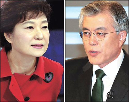 | 18대 대선을 사흘 앞둔 16일 새누리당 박근혜(왼쪽), 민주통합당 문재인 대선 후보가 서울 여의도 KBS에서 양자토론으로 진행된 3차 TV토론에서 주요 쟁점을 놓고 설전을 벌이고 있다. 허정호 기자 |
