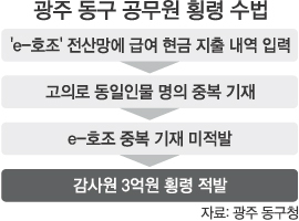 17일 광주시 동구청에 따르면 감사원은 최근 광주시와 5개 구청에 대한 감사에서 동구청 급여담당 공무원 임모(44·여)씨가 건강보험공단 환급금 수억원을 횡령한 사실을 적발했다. 임씨는 3년 전부터 행정안전부가 전국의 자치단체에 보급한 ‘e-호조’ 시스템을 활용해 환급금 등 세입·세출외 현금을 담당했다.