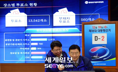 | 분주한 선관위 제18대 대선을 이틀 앞둔 17일 경기 과천시 중앙선거관리위원회에 마련된 종합상황실에서 선관위 직원들이 대선 관리의 막바지 준비에 한창이다. 남정탁 기자 |