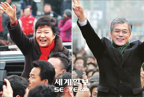 | 한 표라도 더… 새누리당 박근혜(왼쪽 사진), 민주통합당 문재인 대선후보가 선거를 이틀 앞둔 17일 각각 충남 천안 쌍용동 이마트와 서울 여의도역 앞에서 한 표라도 더 보태기 위한 막바지 유세전을 펼치고 있다. 천안·서울=허정호·이제원 기자 |