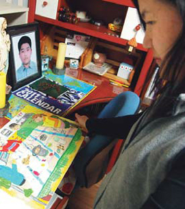 | 친구들의 괴롭힘을 피해 1년 전 하늘나라로 떠나버린 권승민군의 어머니 임지영씨가 14일 아들이 남긴 가족그림을 들여다보고 있다. 승민이는 이 방에서 아직도 살아있는 듯 가족의 보살핌을 받고 있다. |