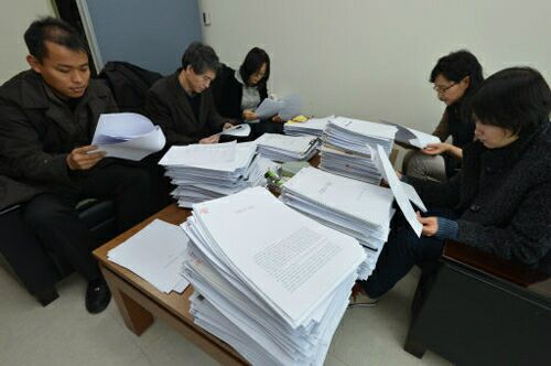 | 2013 세계일보 신춘문예 예심이 열린 16일 수북이 쌓인 원고 더미를 들추며 ‘옥석’을 가려내려는 심사위원들의 눈빛이 날카롭다. 왼쪽부터 문학평론가 이경재, 시인 맹문재·문성해, 소설가 표명희·구경미씨. 남제현 기자 |