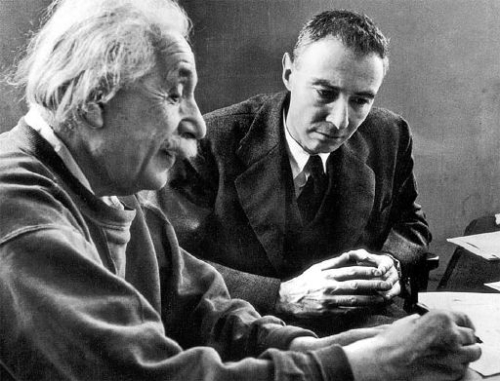| 핵무기 개발에 관여한 과거 때문에 평생 양심의 가책을 받으며 산 아인슈타인(왼쪽)과 오펜하이머. |