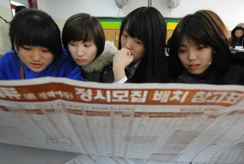 | 2013학년도 대학수학능력시험 성적표가 배부된 지난달 28일 서울시내 한 고등학교에서 수험생들이 정시모집 배치 참고표를 살펴보고 있다. 세계일보 자료사진 |