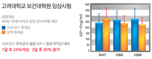 *YGF 251로 IGF-1 분비 촉진 효과 과학적 입증 = 기존 제품의 연구와는 다르게 인체 임상실험을 통해 IGF-1의 분비를 촉진시키는 효과를 과학적으로 입증한 YGF 251은 성장 촉진용 조성물이 함유되어 있어 성장기 유아뿐 아니라 청소년까지 신진대사를 돕고 그에 따라 골격세포 분화 촉진이 왕성하게 이루어지도록 도와주는 역할을 한다. 또한 국내 특허등록은 물론, 미국과 영국, 프랑스, 독일 등 세계적으로 특허를 등록하여 가히 그 효과는 믿을만 하다는 점을 보여준다.