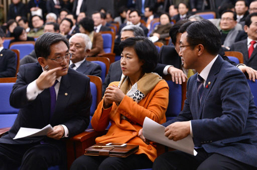 | 24일 서울 여의도 국회에서 개최된 민주통합당 의원총회에서 노영민, 추미애, 윤호중 의원(왼쪽부터)이 이야기를 나누고 있다. 허정호 기자 |