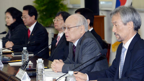 | 인수위원장 전체회의 주재 김용준 대통령직 인수위원장(오른쪽 두 번째)이 10일 서울 종로구 삼청동 인수위 회의실에서 인수위 전체회의를 주재하고 있다. 허정호 기자 |