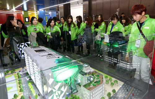 | “서울시민청엔 뭐가 있나?” 12일 개관을 앞둔 서울시 신청사 내 ‘서울시민청’이 10일 언론에 공개된 가운데 시에서 아르바이트를 하고 있는 대학생들이 내부에 전시된 신청사 구조물을 살펴보고 있다. 연합뉴스 |