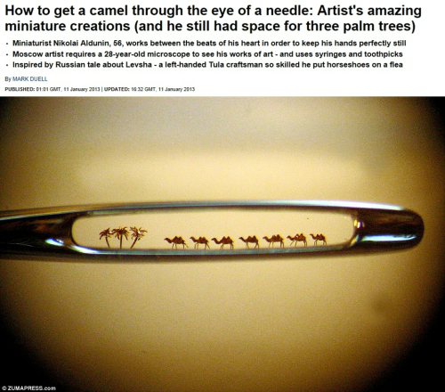 러시아 모스크바 출신의 초미세 조각가 니콜라이 알두닌(56)이 바늘구멍에 낙타를 조각해 화제를 모으고 있다.
