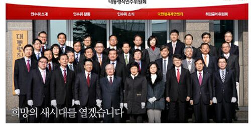 | 박근혜 대통령 당선인의 대통령직인수위원회 공식 홈페이지(www.korea2013.kr)가 13일 개설됐다. 초기 화면에 박 당선인과 인수위원들의 기념촬영 사진이 실렸고 ‘인수위 소개’와 ‘인수위 활동’, ‘인수위 소식’, ‘국민행복제안센터’, ‘취임준비위원회’로 구성됐다. 연합뉴스 |