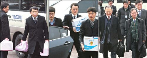 | 보따리·상자·가방… 업무보고 진풍경 대통령직인수위원회의 ‘노(NO) 홀리데이’ 선언에 휴일인 13일 지식경제부와 경찰청, 국토해양부 관계자들(왼쪽 사진부터)이 각각 업무보고 서류가 담긴 보자기 등을 들고 서울 종로구 삼청동 인수위 사무실로 들어가고 있다. 연합뉴스 |