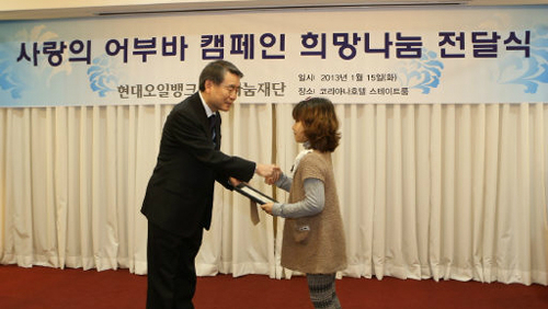 현대오일뱅크 장학증서 전달 입력 : 2013-01-15 22:25:39 수정 : 2013-01-15 22:25:39 구글 네이버 유튜브 15일 서울 중구 태평로 코리아나호텔에서 열린 ‘사랑의 어부바 캠페인’ 전달식에서 김창기 현대오일뱅크1%나눔재단 이사장(왼쪽)이 어린이에게 장학증서를 전달하고 있다. 현대오일뱅크는 지난해부터 저소득층, 조손·결손 가정 아동 100명을 선정해 1년간 월 20만원씩 장학금을 지원하고 있다. 현대오일뱅크 제공 Copyright ⓒ 세계일보. 무단 전재 및 재배포 금지 세계일보