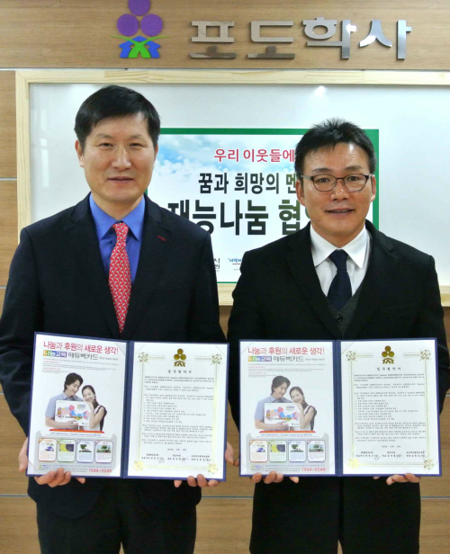 | SK텔링크 기업사업본부장 안태호 상무(좌)와 포도학사 평생교육원 박재석 회장(우)이 알뜰폰 사업 상호협력에 관한 포괄적 업무협약을 체결하고 있다. |