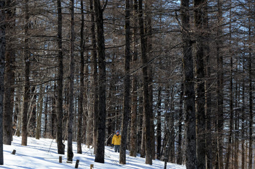 | 만항재에 빼곡히 들어선 낙엽송. 아래는 무릎까지 빠질 정도로 눈이 쌓여 있다. |