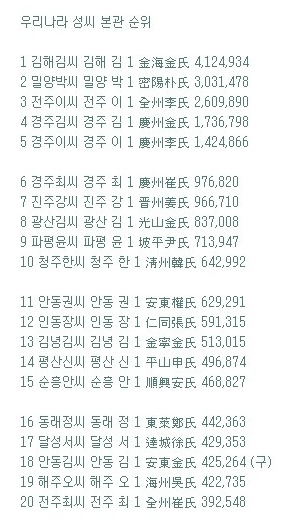우리나라 성씨 본관 순위, "나는 몇 위일까"