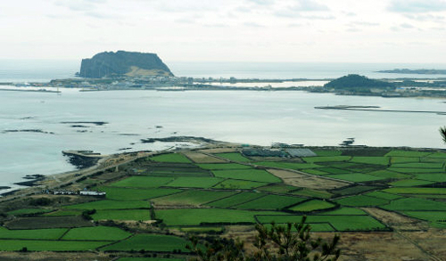 | 제주 지미봉에 오르면 종달리의 푸른 채소밭이 발아래에 펼쳐진다. 성산일출봉에서 불어오는 바람을 맞으며 이 녹색의 땅을 내려다보면 몸과 마음이 개운해지는 느낌이다. |