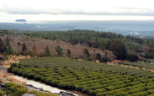 서귀포시 색달동 해발 500m 한라산 자락에 자리한 제주 다원은 16만5000㎡(5만여평)의 차밭을 보유하고 있다. 한겨울에도 짙은 푸른색이 감도는 차밭 사이에 탐방로가 놓여 있다. 이곳의 전망대에 오르면 차밭과 저 멀리 강정포구와 범섬, 문섬 등 제주도의 남쪽 해안이 한눈에 들어오는 파노라마가 펼쳐진다.