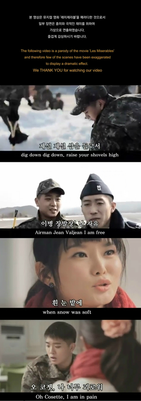 공군본부 문화홍보과 공감팀은 5일 동영상 전문사이트 유튜브에 ‘레 밀리터리블’이라는 제목의 영상을 올렸다. 지난해 12월 개봉한 뮤지컬 영화 ‘레 미제라블’을 공군이 패러디한 영상이다.