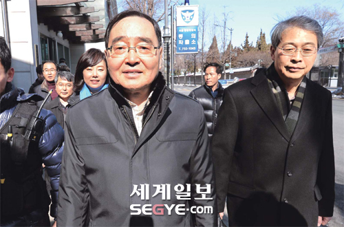 | 정홍원 국무총리 후보자(왼쪽)가 11일 임종룡 국무총리실장 등과 함께 서울 종로구 통의동 금융감독원 연수원에 마련된 집무실을 나서고 있다. 이제원 기자 |
