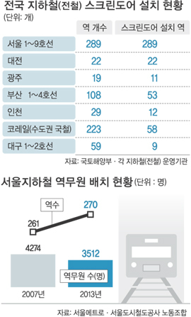 지하철 역사 내 안전 문제도 개선되지 않고 있다. 오히려 예산 절감과 자동화기기 도입에 따른 근무인력 감소로 일부역의 경우 역무원 한 명만이 근무하는 실정이다. 사고 발생 때 대형 인명피해가 우려되는 이유다.