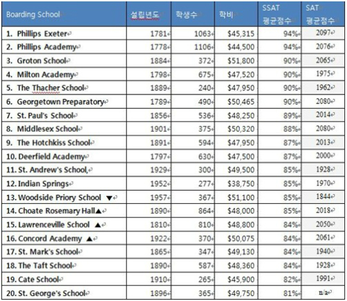 조기유학 전문 엘유학원(www.luhak.com/)이 ‘2013 공부 잘하는 학생들이 입학하는 학교’ 랭킹을 발표했다. SSAT 성적을 기반으로 상위 20개의 좋은 평가를 받은 보딩스쿨에 대한 조사다.