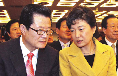 | 박근혜 대통령 당선인은 18일 초대 청와대 비서실장에 최측근인 허태열 전 새누리당 의원을 내정했다. 사진은 2011년 11월 한 출판기념회에서 박 당선인(오른쪽)과 허 전 의원이 대화를 나누는 모습. 세계일보 자료사진 |