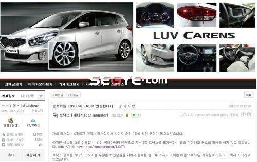 | ▶ 쉐보레 트랙스를 기다리며 2만2000여 명이 모인 동호회 홈페이지. 20일 12시쯤 가격이 발표되자 기아 카렌스 동호회로 간판을 바꿔달았다. |