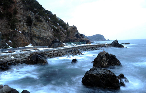 | 강릉의 금진항과 심곡항을 잇는 ‘헌화로’(獻花路)는 가파른 절벽과 바다 사이에 놓인 아슬아슬한 해안도로다. 해질녘 헌화로 앞 동해 바다가 포효하고 있다. 바위를 때리며 몰아치는 저 파도가 겨울 강릉 바다의 매력이다. |