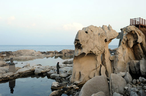 | 주문진 소돌마을의 아들바위는 동해의 거친 파도에 종잇장처럼 찢긴 듯한 기이한 모양이다. |
