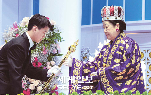 | 한학자 세계평화통일가정연합 총재(오른쪽)가 ‘기원절’인 22일 경기 가평군 설악면 송산리 청심평화월드센터에서 열린 ‘천지인참부모님 천일국 즉위식’에서 손자 문신출군으로부터 ‘천황봉(天皇棒)’을 봉정받고 있다. 천황봉은 천일국 황제로서의 권위를 상징하는 예물이다. 가평=이제원 기자 |