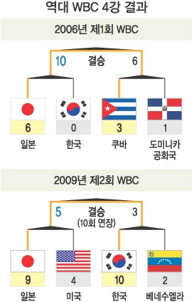 2006년 초대 WBC에서는 한국, 일본, 쿠바, 도미니카가 4강에 올랐다. 세계 최강으로 꼽혀온 미국은 4강에도 들지 못했다. 원년 챔피언은 일본의 차지가 됐다. 제2회 WBC도 아시아 야구의 축제로 끝났다. 일본이 대회 2연속 정상에 올랐고, 한국이 준우승을 차지했다.