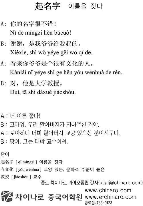 [生生 중국어 한마디] 이름을 짓다 입력 : 2013-02-25 18:01:45 수정 : 2013-02-25 18:01:45 구글 네이버 유튜브 Copyright ⓒ 세계일보. 무단 전재 및 재배포 금지 세계일보