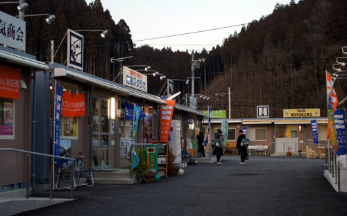 | 쓰나미가 밀려오기 직전까지 재해대피 방송을 하다 숨진 엔도 미키로 유명해진 미야기현 미나미산리쿠초는 방재청사 등 몇개 건물을 제외하곤 잔해 처리가 거의 마무리됐다. 사진은 미나미산리쿠초와 인근 고지대에 세워진 임시 상점가. |