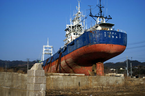 | 쓰나미로 바다에서 1㎞ 떨어진 미야기현 게센누마 시내로 떠밀려온 어선 ‘제18 교토쿠마루호’. 대지진과 쓰나미의 아픔을 보여주는 이 배를 ‘기념물’로 보존할 것인지를 놓고 논란이 벌어지고 있다. |