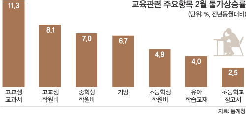 교육관련 물가의 지역별 편차도 컸다. 2월 학원·보습교육 물가는 대구가 작년 같은 달보다 9.5% 올라 상승폭이 가장 컸고, 이어 경북(8.4%), 광주(8.3%), 충남(8.1%) 등이 높았다. 반면 경기(5.1%), 서울(5.0%), 부산(3.9%), 대전(3.4%), 인천(2.5%) 등 수도권 등은 상대적으로 낮았다.