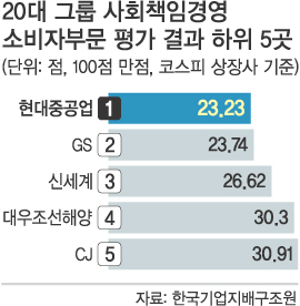 그룹별로 보면 백화점과 대형마트 중심인 신세계, 건설과 편의점·홈쇼핑 사업에 치중하는 GS, 현대중공업이 20점대에 그쳐 하위권에 머물렀다. 식품을 비롯한 소비재 관련 계열사가 많은 CJ도 30.91점으로 평균에 못 미쳤다.