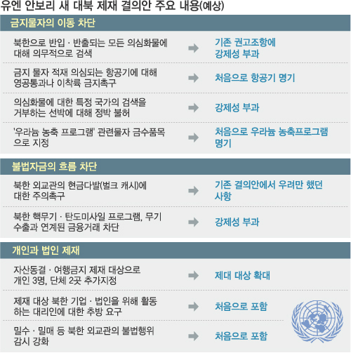 5일(현지시간) 월스트리트저널 등 외신에 따르면 미국이 중국과 합의로 마련해 회원국에 회람한 결의안 초안에는 ‘각국이 공급·판매·거래·수출이 금지된 품목의 화물을 실은 것으로 합리적 의심이 드는 정보가 있을 때 자국 영토에 있거나 통과하는 모든 북한 관련 화물을 의무적으로 검색해야 한다’는 내용이 포함됐다. 그동안 의심화물을 실은 선박에 대해 검색을 촉구(call on)하던 것을 대폭 강화한 것이다.