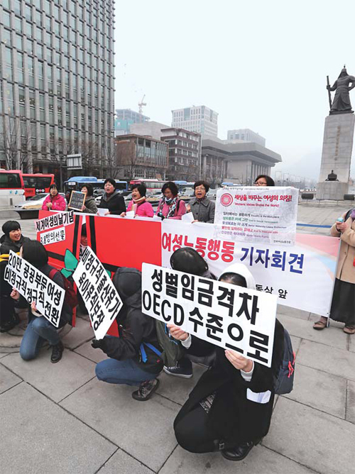 | 세계여성의날 105주년을 하루 앞둔 7일 서울 광화문광장 이순신 동상 앞에서 열린 생생여성노동행동 기자회견에서 활동가들이 비정규직의 출산·육아휴직 보장, 공공부문 여성비정규직의 정규직 전환, 성별 임금격차 해소 등 근로 현장의 성차별 시정을 촉구하는 시위를 하고 있다. 연합뉴스 |