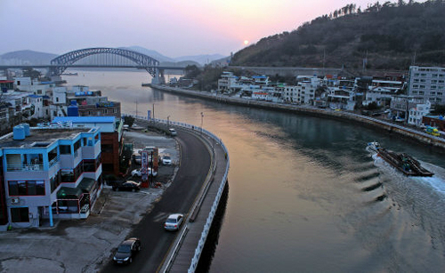 통영에서 빠트릴 수 없는 또 다른 명소가 육지와 미륵도를 연결하는 통영대교와 그 아래를 흐르는 통영운하다. 해 질 녘 동쪽 충무교에 올라 서쪽 통영대교를 바라보면 서북쪽 산에 걸린 석양이 S자로 흘러가는 통영운하에 붉은 그림자를 드리운다. 바닷물 왕래를 막던 모래를 걷어내고 1932년 만들어진 통영운하는 한산대첩 때 이순신 장군의 수군에 패퇴한 왜군이 떼죽음을 당한 곳이기도 하다. 이 일대는 통영 최고의 야경 명소다. 밤이면 통영대교에 조명이 켜지고 그 불빛이 그대로 통영운하에 비쳐져 멋진 밤 풍경을 연출한다.