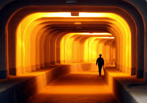 | 통영운하 밑을 지나는 해저터널. 터널의 형태와 조명이 어우러져 독특한 아름다움을 빚어낸다. |