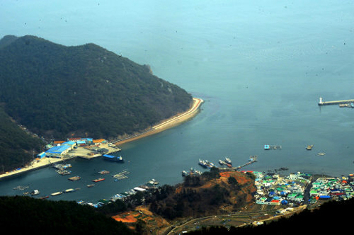 | 미륵산 정상에서 내려다본 삼칭이길. |